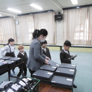 体育館での始業式が終わり、教室に戻ったあと、新しいタブレットを配布しました。