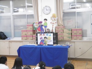 万引きをしてしまった少年について、人形劇を用いてお話をしていただきました。 |